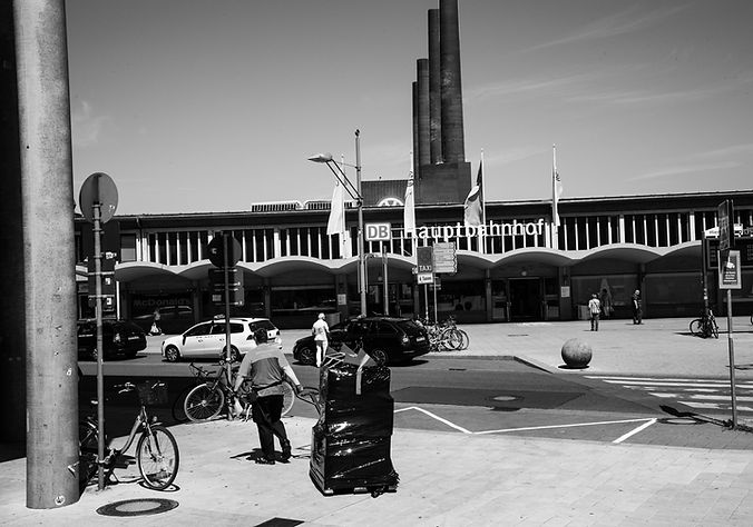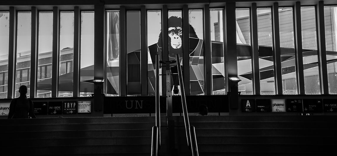 De l'extérieur la gare de Wolfsburg paraît inchangée, aussi immuable que les immenses cheminées de l'usine Volkswagen qui la surplombent. Mais à l'intérieur le regard vide d'un chimpanzé ailé trône sur une gare moderne et aseptisée. J'ai beau en explorer le moindre recoin, impossible de retrouver les traces des décors des toilettes et du petit café où Robert égrène comme une litanie les destinations possibles au départ de Wolfsburg...
